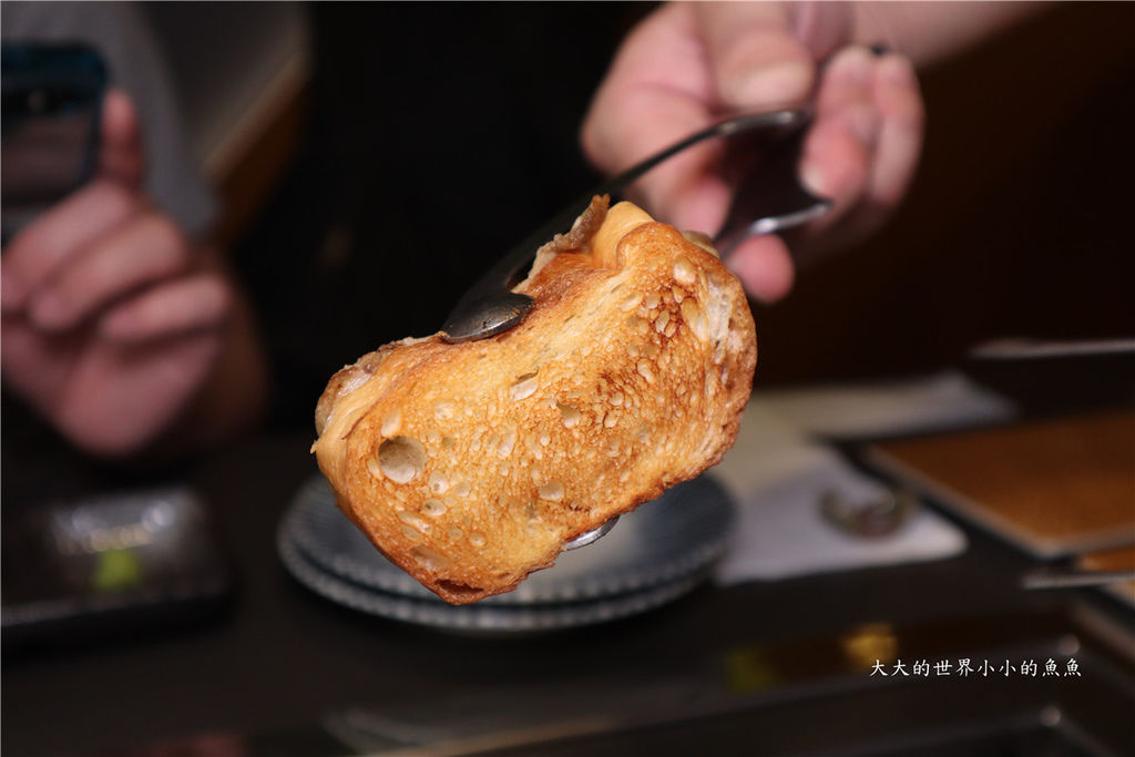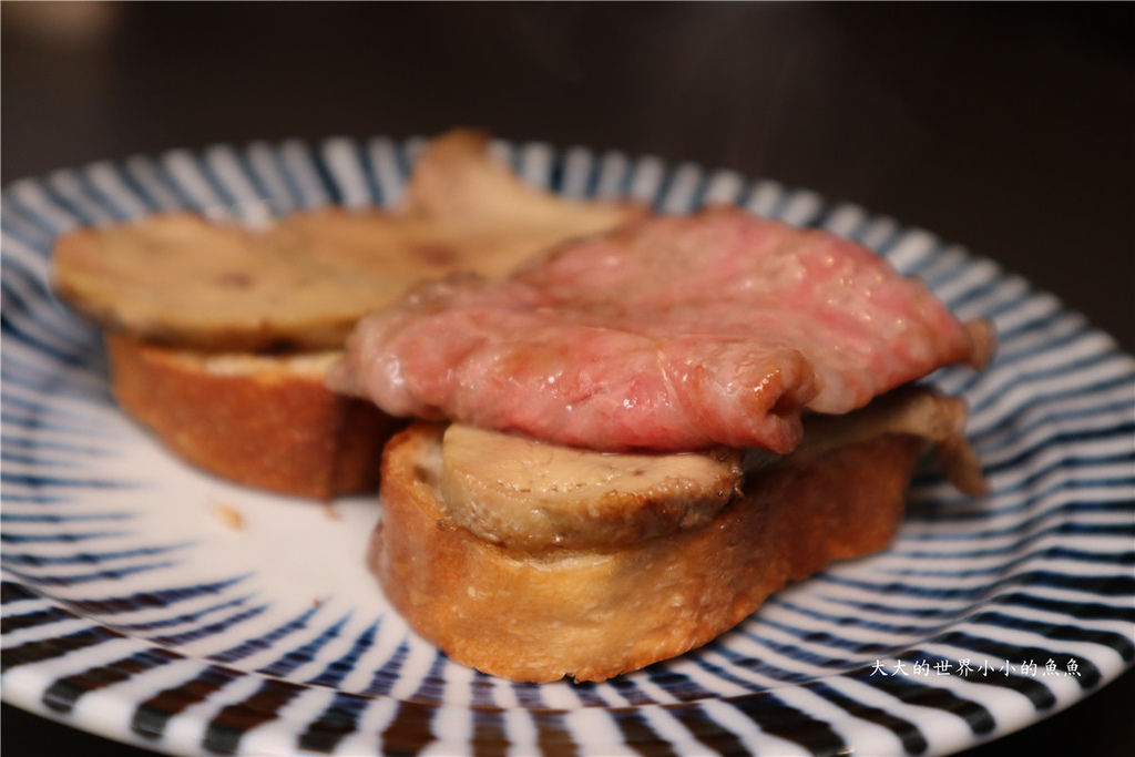 麵包餅皮一定要烤到酥脆,搭配上層的鵝肝和和牛一起吃。